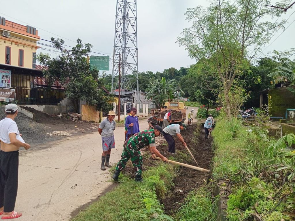 Dengan penuh semangat anggota Koramil, bersama warga gotong royong membersihkan saluran air yang tersumbat akibat banyaknya sampah dan tanah didalam saluran irigasi yang menyebabkan tersumbatnya aliran air sehingga rawan terjadi luapan ke jalan.