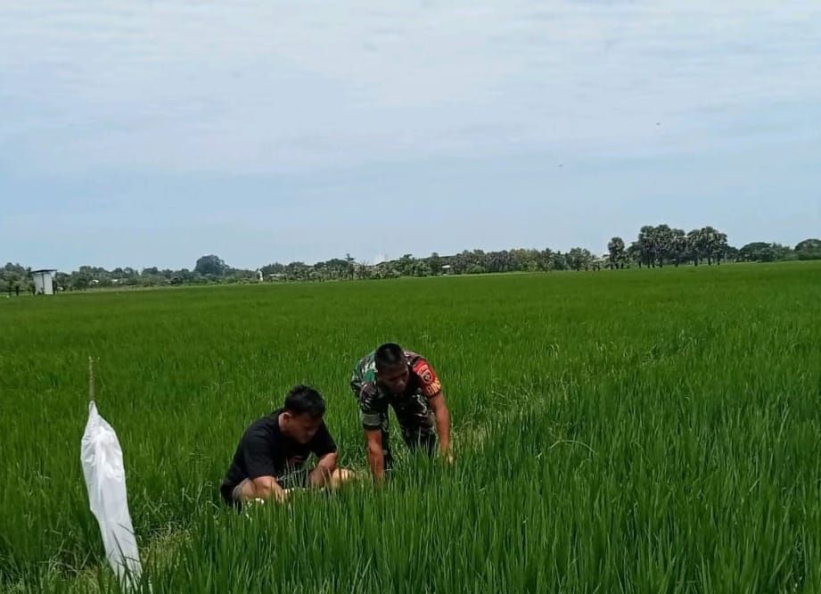 Personel Babinsa Jajaran Kodim Takalar bersama para petani melaksanakan pembersihan hama gulma dengan cara menyemprotkan cairan pestisida, pembersihan tanaman pengganggu, pembongkaran sarang tikus dan penyiangan tanaman padi.