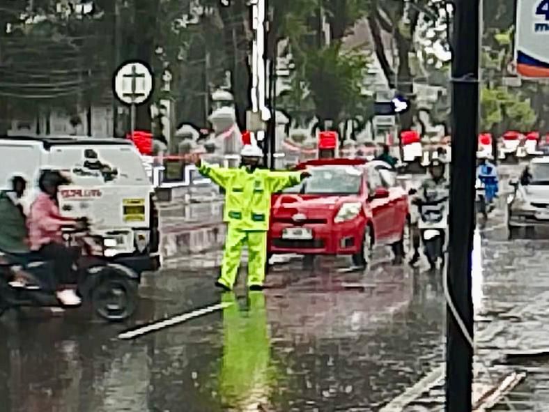 Pantauan di lapangan menunjukkan para petugas berjaga di persimpangan jalan, sekolah, dan area padat lalu lintas dengan jas hujan lengkap. Mereka memastikan kendaraan tetap berjalan lancar dan membantu para pejalan kaki menyeberang dengan aman