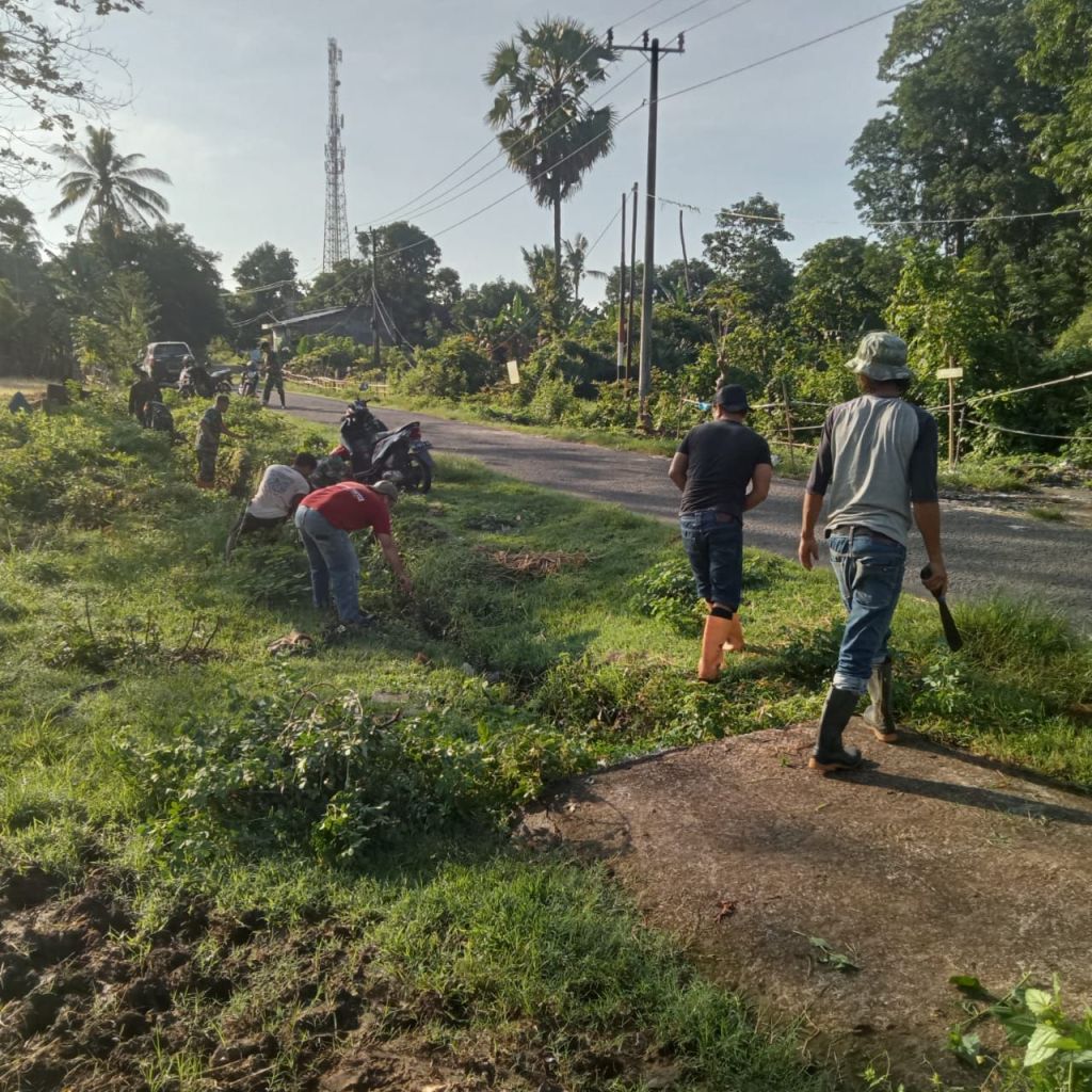 Sangat nampak terlihat di lokasi kegiatan para personel Koramil bersama warga bahu membahu melaksanakan pembersihan sampah dan rumput liar yang menyumbat saluran air serta merusak pemandangan.