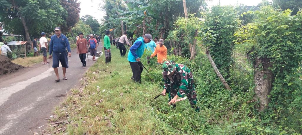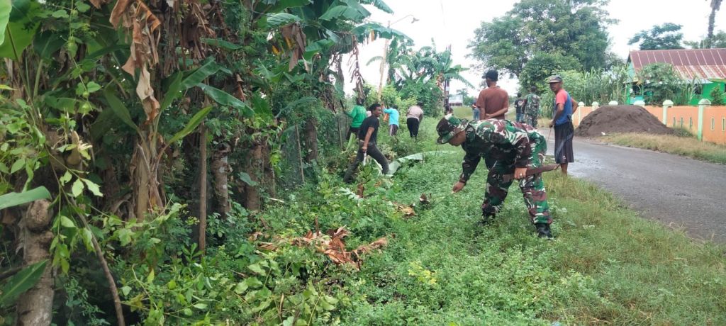 Sangat nampak terlihat di lokasi kegiatan para personel Koramil bersama warga bahu membahu melaksanakan pembersihan sampah dan rumput liar yang menyumbat saluran air serta merusak pemandangan.