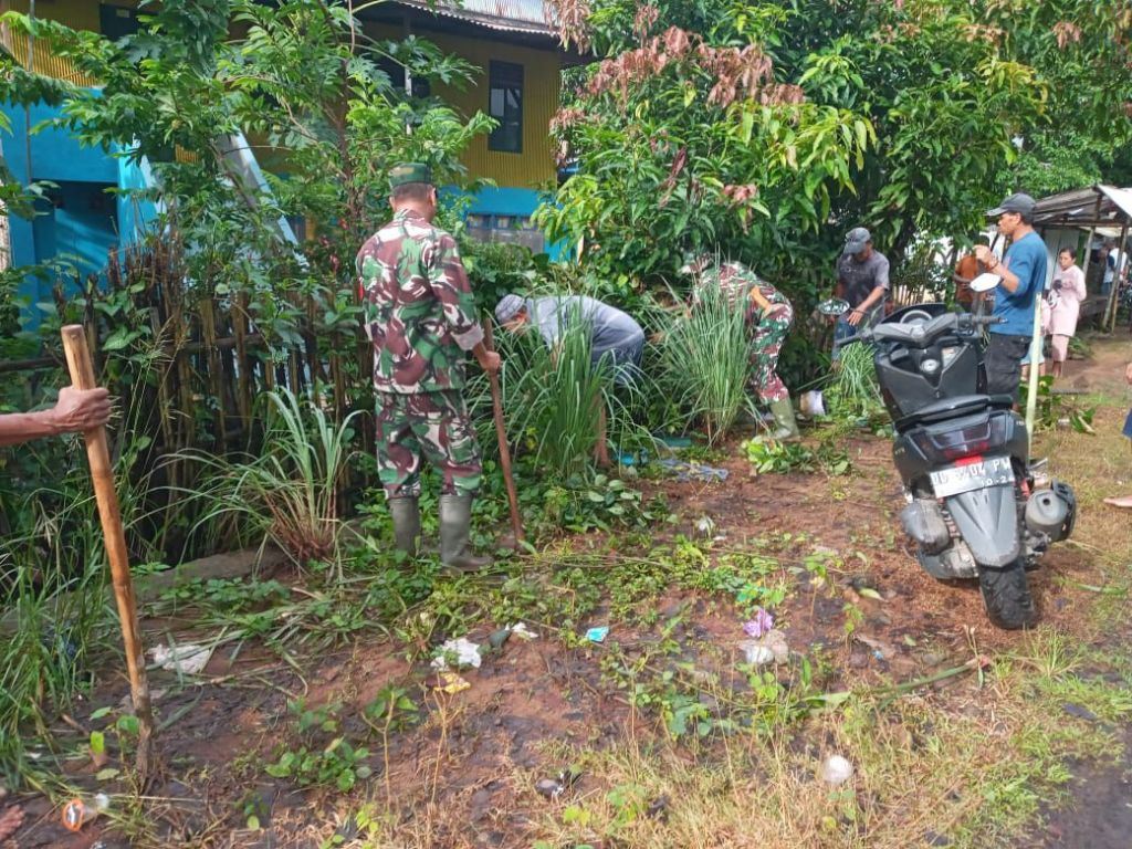 Sangat nampak terlihat di lokasi kegiatan para personel Koramil bersama warga bahu membahu melaksanakan pembersihan sampah dan rumput liar yang menyumbat saluran air serta merusak pemandangan.