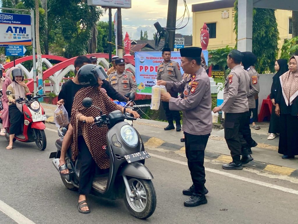 Takalar, Sulawesi Selatan / linsrikandi24.com – Sebagai bentuk kepedulian dan kebersamaan di bulan suci Ramadhan, Polres Takalar melalui Seksi Bagian Logistik menggelar bakti sosial berupa pembagian takjil bagi masyarakat pengguna jalan. Kegiatan ini berlangsung di Jalan Poros Jenderal Sudirman, tepatnya di depan Pos Kamseltibcar Lantas Polres Takalar, dan dipimpin langsung oleh Kabag Log Polres Takalar, Kompol Zeim Arman, SE.,MH Kamis, 14/03/2025.