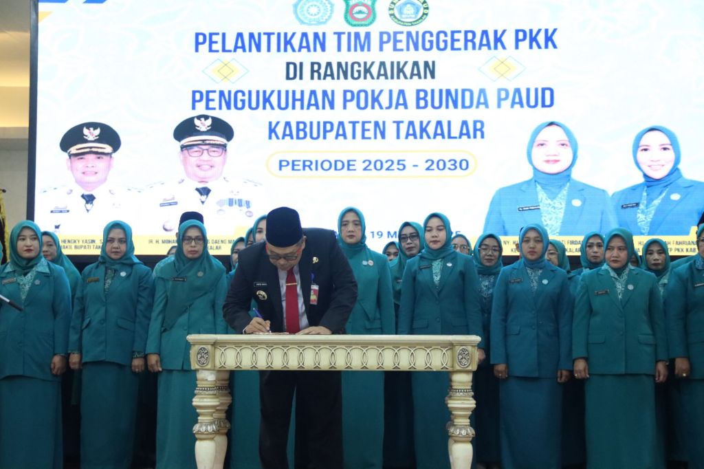 Proses pelantikan Pengurus PKK Kab. Takalar Masa Bakti 2025-2030 dirangkaian dengan Pengukuhan Pokja Bunda PAUD Kab. Takalar berlangsung di Ruang Pola Kantor Bupati Takalar.