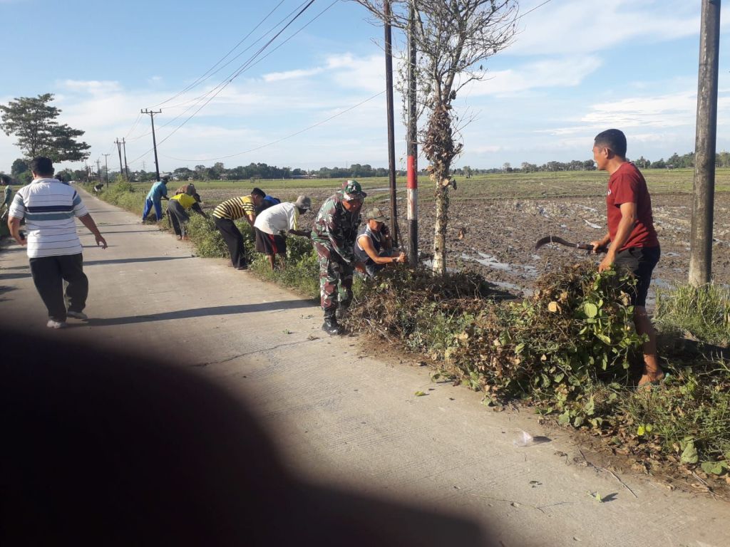 Personel Koramil mengajak warga untuk aktif dan menjadi motivator penggerak masyarakat untuk gotong royong peduli terhadap kebersihan lingkungan. Kegiatan kerja bakti tersebut fokus pada pembersihan pinggir kiri kanan jalan yang telah tumbuh rumput liar dan banyak sampah yang mengotorinya.