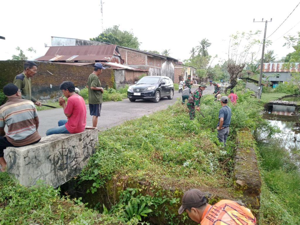 Personel Koramil, bersama warga gotong royong membersihkan saluran air dan pinggir jalan yang telah rimbun oleh rumput liar serta saluran air tersumbat akibat banyaknya sampah dan tanah didalam saluran air yang menyebabkan aliran air tidak lancar.