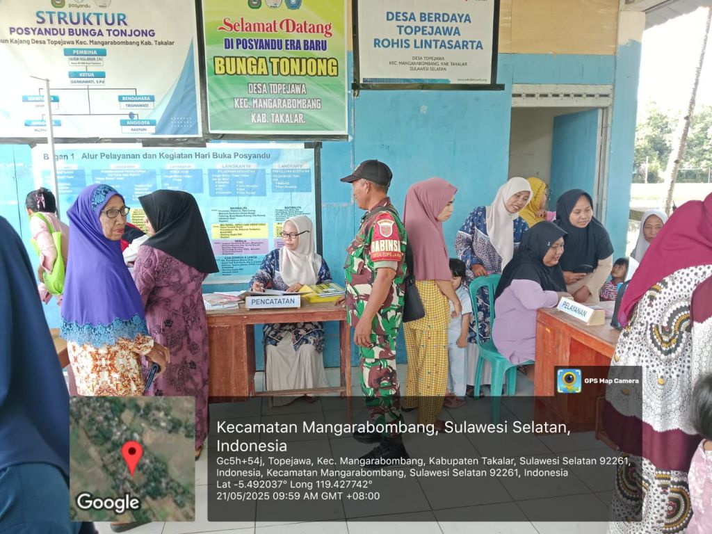 TAKALAR / linsrikandi24.com – Dalam menurunkan angka kematian ibu dan bayi, Stunting, meningkatkan kualitas hidup keluarga, dan memberdayakan masyarakat dalam hal kesehatan, Babinsa Koramil 1426-05/Polut Kodim 1426/Takalar Sertu Japri melaksanakan pendampingan penimbangan berat badan dan pengukuran tinggi badan Balita di Posyandu Desa Tope Jawa, Kecamatan Mangarabombang Kabupaten Takalar. Rabu (21/05/2025)