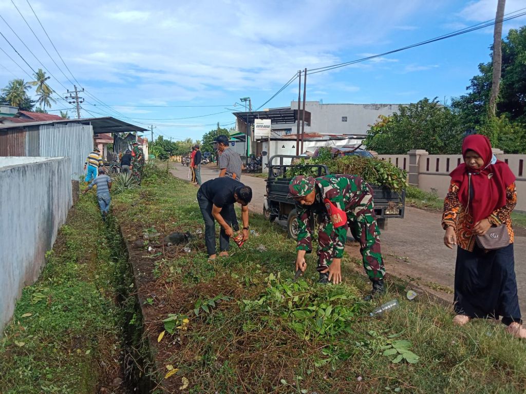 Personel Koramil mengajak warga untuk aktif dan menjadi motivator penggerak masyarakat untuk gotong royong peduli terhadap kebersihan lingkungan. Kegiatan kerja bakti tersebut fokus pada pembersihan selokan dan pinggir jalan akibat banyak sampah yang mengotori.