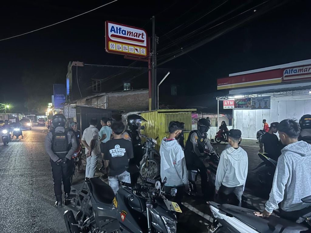 Patroli menyasar titik-titik rawan yang berpotensi menimbulkan gangguan kamtibmas, salah satunya di depan Alfamart Kelurahan Pattallassang, Kecamatan Pattallassang, Kabupaten Takalar.