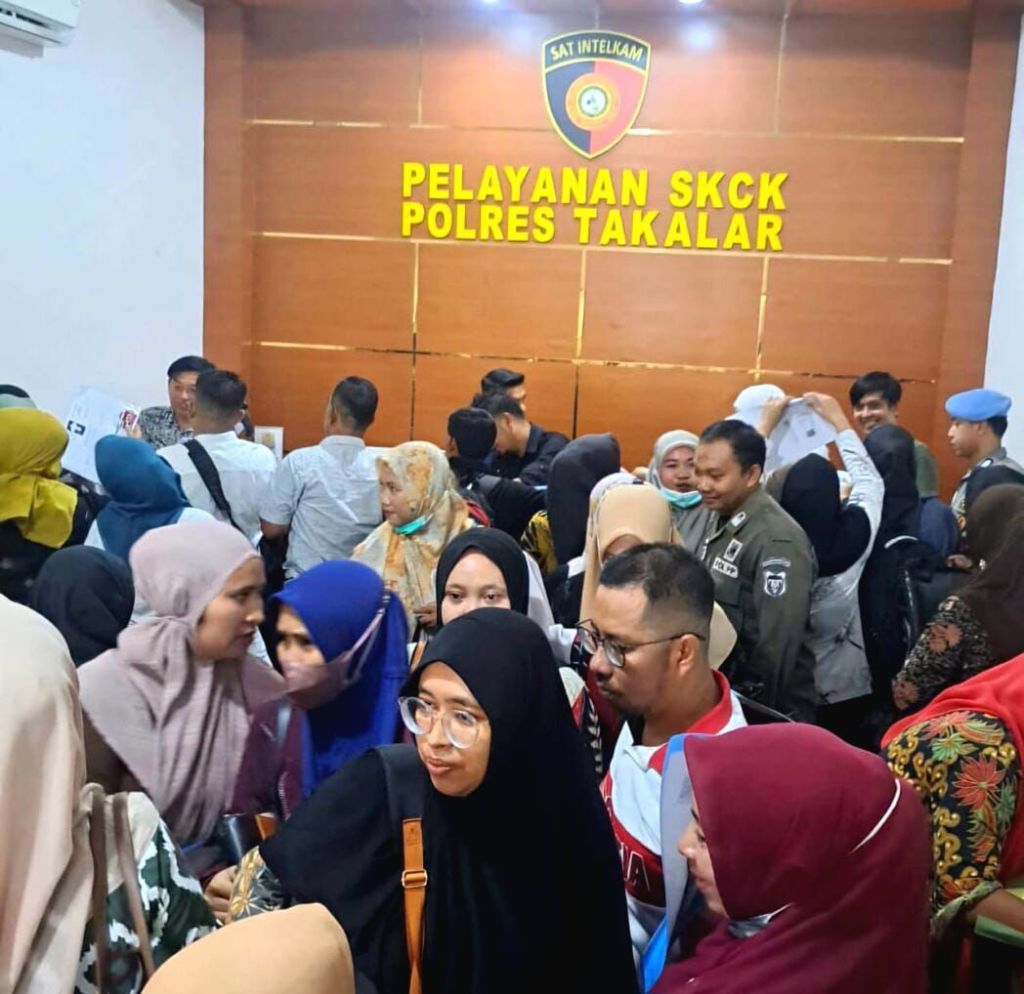 TAKALAR / linsrikandi24.com – Lonjakan masyarakat yang mengurus Surat Keterangan Catatan Kepolisian (SKCK) terjadi di Polres Takalar, pasca pengumuman Pemerintah Kabupaten Takalar terkait daftar non-aparatur sipil negara (non-ASN) yang lolos seleksi untuk diangkat menjadi pegawai pemerintah dengan perjanjian kerja (PPPK) paruh waktu.