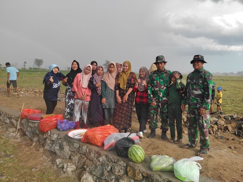 Kedatangan kaum emak-emak ini diprakarsai oleh ibu kepala Desa, ia membawa bungkusan berisi sejumlah makanan, buah dan minuman ringan. Tak lupa pula teh manis dan kopi hangat disuguhkan kepada para personil Satgas TMMD dan masyarakat yang sedang mengerjakan sasaran fisik pengerasan jalan.