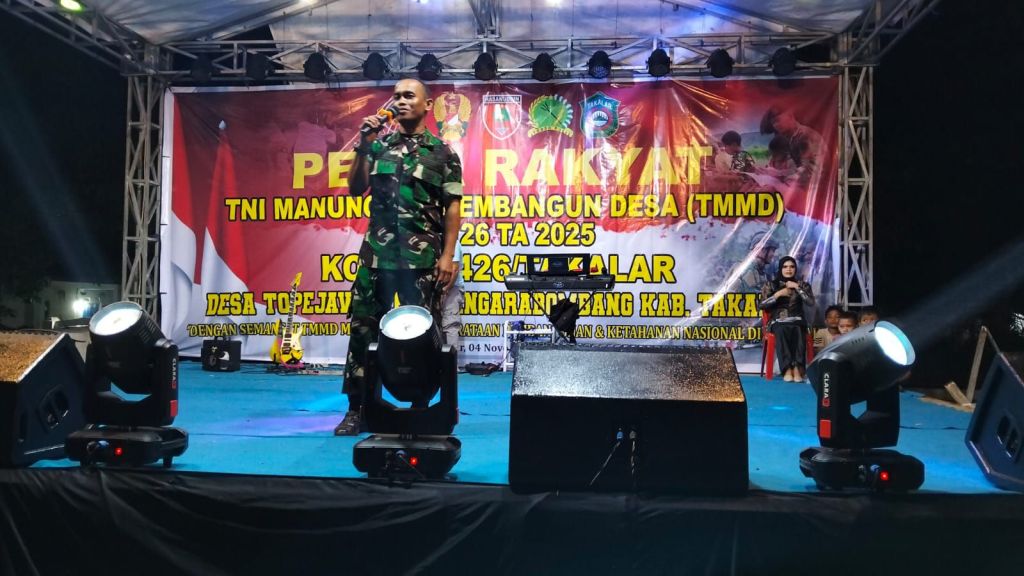 TAKALAR / linsrikandi24.com — Ribuan warga memadati Lapangan Sepak Bola Desa Topejawa, Kecamatan Mangarabombang, Kabupaten Takalar, pada Selasa malam (4/11/2025), untuk menghadiri Pesta Rakyat TMMD ke-126 Kodam 1426/Takalar yang mengusung tema “TNI Selalu di Hati Rakyat.” acara ini berlangsung meriah dan penuh kebersamaan, mencerminkan eratnya hubungan antara TNI dan masyarakat.