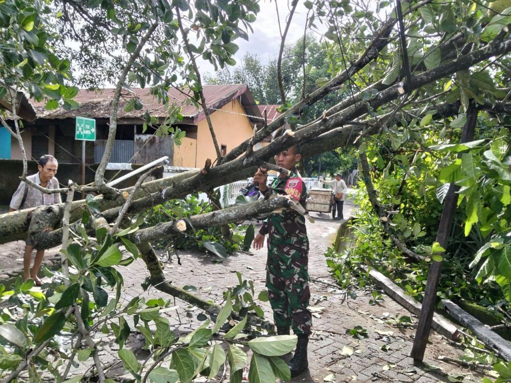 Babinsa bersama warga sekitar bergerak cepat membantu membersihkan pohon yang tumbang dengan menggunakan peralatan seadanya. Dengan adanya peristiwa ini, Babinsa menyampaikan bahwa sudah menjadi tugas dan tanggung jawab kami sebagai Babinsa untuk berada di tengah-tengah kesulitan warga seperti sekarang ini melakukan evakuasi pohon yang menimpa rumah kebun warga dan tiang listrik, “ucapnya